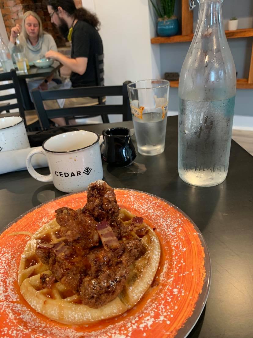 Patrons have raved over the Crabby Ben, and Biscuit Bowl for breakfast even thou my favorite is the Chicken and Waffles, which will fill you up. The lunch menu favorites include the Cedar Burger, Firebird, and the BLTS Salad.