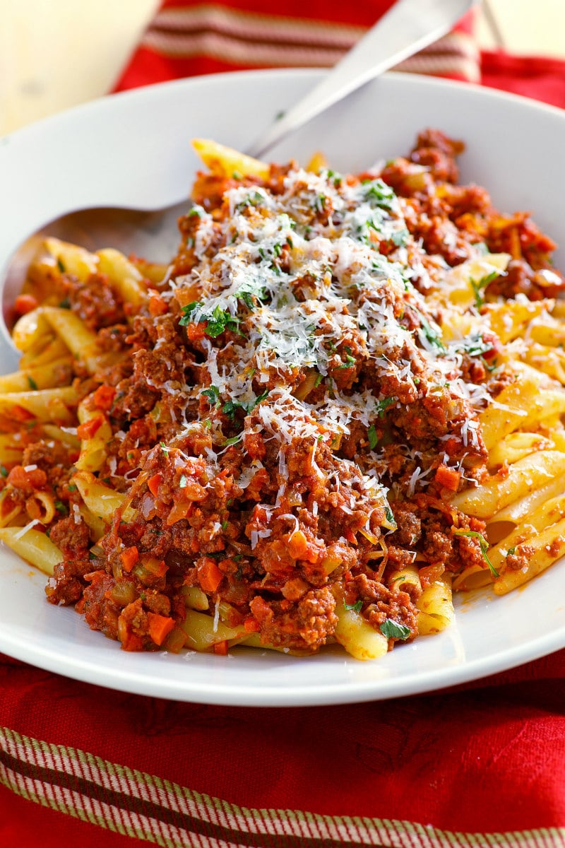 - Toss the pasta (cook off only as much pasta as you need at the time: half a pound for every 3 people) with a couple of ladles of sauce to coat, then top the bowl with extra sauce. Top the pasta with lots of cheese, as desired.