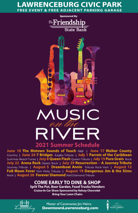 Announcing the 2021 Music on the River line-up! From rock to country these regional and local bands are sure to have something for everyone. Concerts take place on Thursday evenings from 7-9P at the Civic park, in the heart of historic Lawrenceburg. Join us for food trucks, local food vendors and a beer garden all in a family friendly atmosphere. Many of our downtown restaurants offer takeout options that can be enjoyed while you watch the show. Free parking is available in the adjacent parking garage. Remember to bring your lawn chairs! Music on the River is sponsored by Friendship State Bank. The weekly cruise-in car show is back this year on High Street, sponsored by Kelsey Chevrolet. 2021 will also bring back the split the pot raffle, where proceeds are distributed to local nonprofits.