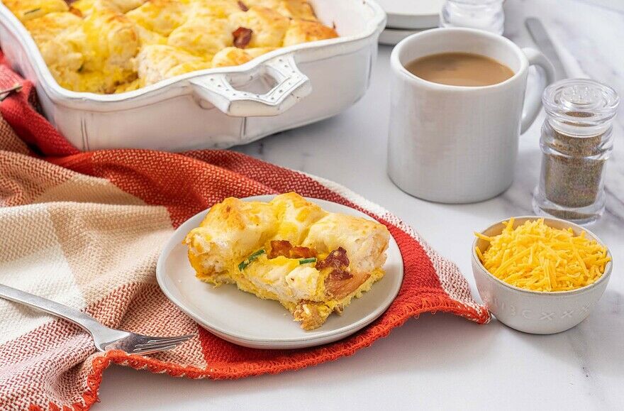 Pour everything into the prepared casserole dish and bake until the eggs are firmly set and the biscuits are puffy and golden brown, about 25-minutes.