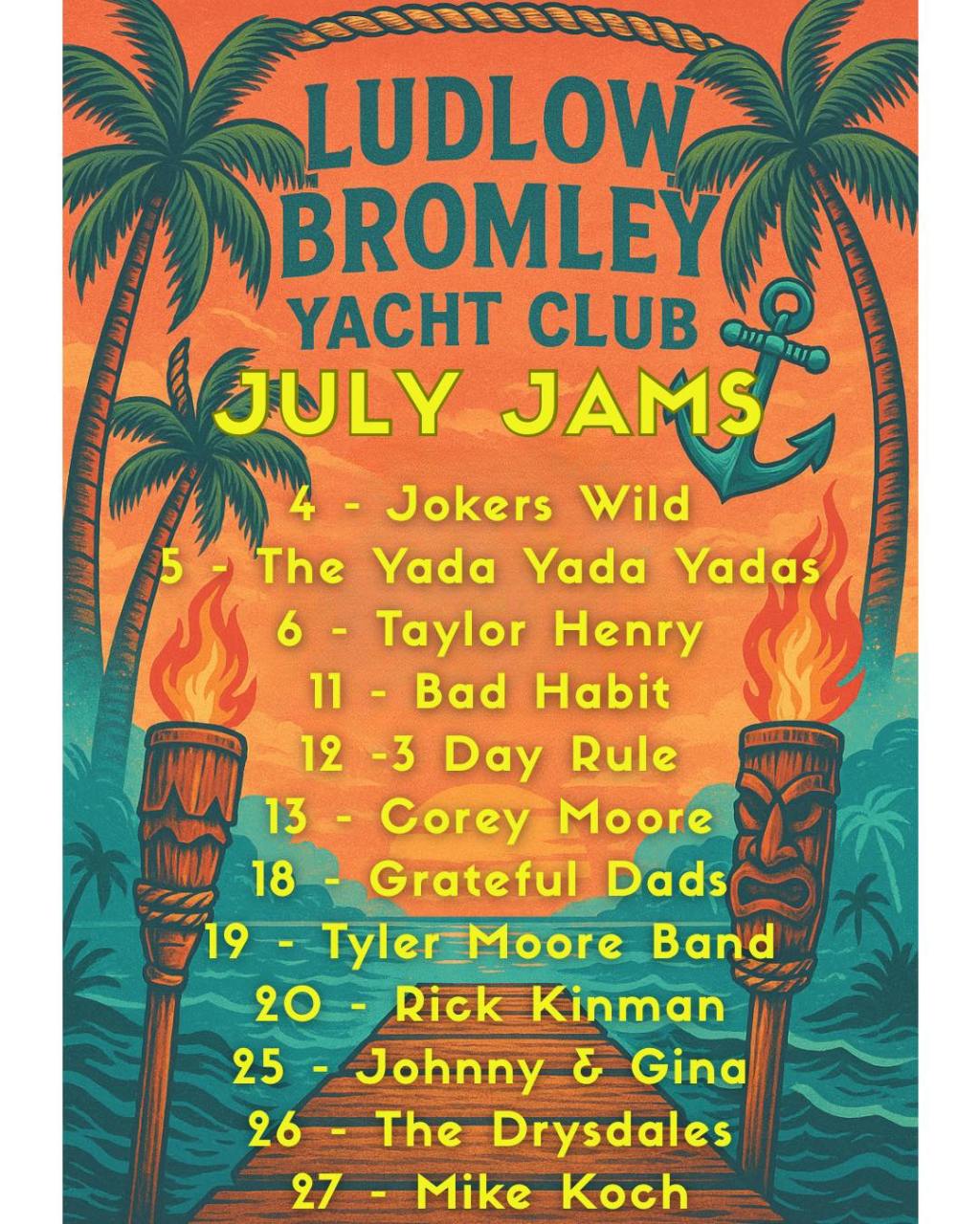 The recently re-opened food and entertainment establishment known to many as the Yacht club has named the July music venues.