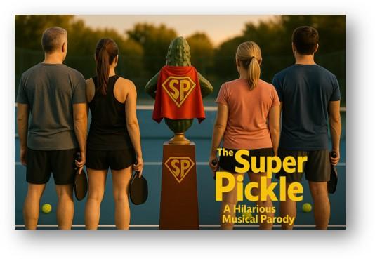 Part musical parody, part pop-culture roast, The Super Pickle is a fast-paced comedy that serves up a ridiculous take on the pickleball phenomenon sweeping the nation. Set on the courts where seasoned veterans face off against eager newcomers, this uproarious show spoofs everything from sports rivalries to over-the-top superhero tropes. With pop-hit parodies reminiscent of “Weird Al” Yankovic, outrageous original songs, and side-splitting humor, it satirizes the pickleball craze while playfully poking fun at tennis traditionalists. From competitive showdowns to lively social games, The Super Pickle is a rollicking good time for theatre lovers, comedy fans, and anyone who’s ever swung a paddle.