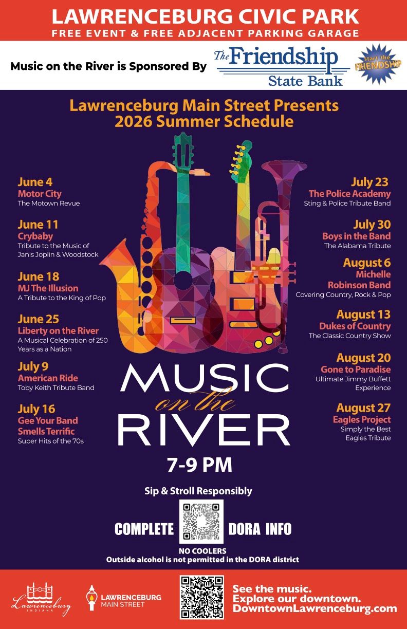 Lawrenceburg, Indiana will host 12 weeks of music this summer on specific nights between 7pm to 9pm at the Civic Park long the riverfront. While there enjoy the culture, community, stores and restaurants. It will keep you coming back for more.